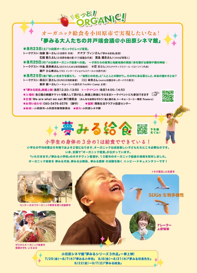 また上映後に「夢みる大人たちの井戸端会議」トークイベントの開催も予定されており、8/25(月)の回は、「小田原オーガニック給食への道」~子供たちの食育と地産地消の実践!命を繋げる植物や菌の神秘~のタイトルの元、おだわら・もあな保育園園長の中島が登壇いたします。