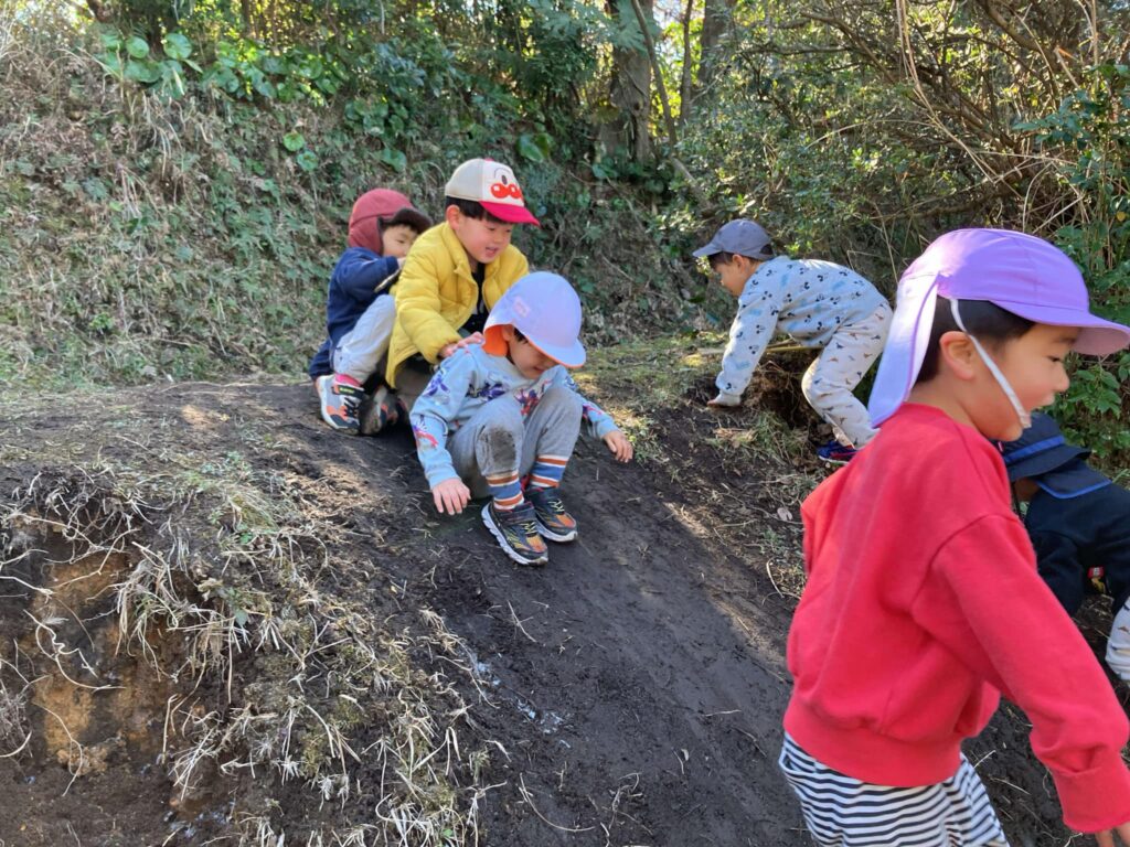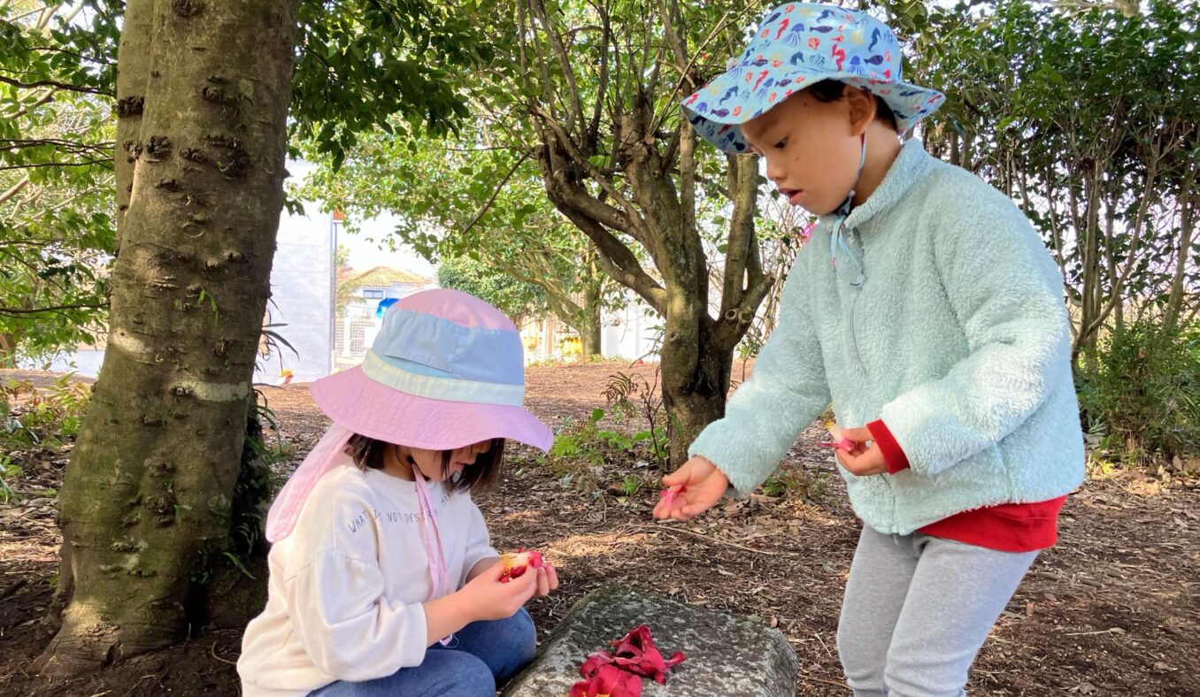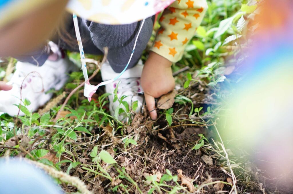 園庭に遊具はありませんが、園の敷地内に小さな森。葉っぱ、石ころ、小さな生きものはたくさん。自然がすぐ隣にあるという環境。こどもたちは毎日敷地内の森に出て、自らの手で見つけて、触れて、つくって、泥んこになって遊んでいます。